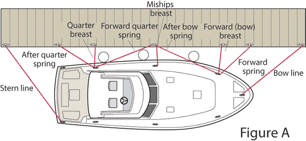 Here is a good way to tie up a boat if docked in a slip. Make sure to give enough slack in case water level rises or falls.